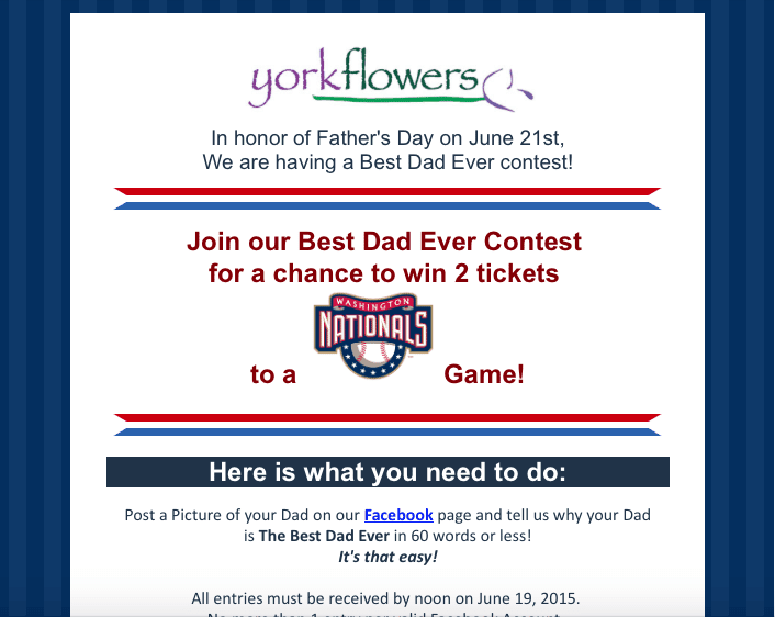 To draw attention to the shop’s selection of fruit and gourmet baskets, plants and balloons, York Flowers is hosting a “Best Dad Ever” contest for the chance to win two tickets to a Washington Nationals game. To enter, fans have to post a photo of their father with a short description (60 words or less) of why he’s no. 1. The winner, not selected at press time, got to choose the game. Owner Ken Denaburg said tickets were typically available for $11.