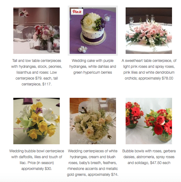 She tries, for instance, to take a good photo or two every time she sets up a wedding. She then adds to the image(s) to one of the appropriate category (bouquets, centerpieces, ceremony flowers) on her wedding page and adds a caption (with specific flower names), an approximate price (“people want to know, even if it’s only a ballpark figure,” she said), and a “Pin It” button (so interested customers can save an idea while simultaneously spreading the Blumengarten name to their Pinterest followers).