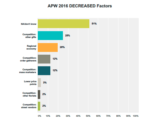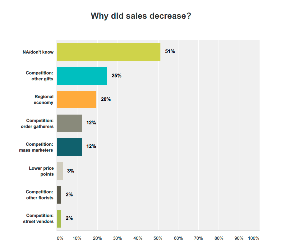 A quarter of respondents who saw a decrease blamed competition from other gifts (non-floral vendors) and 20 percent laid the blame on their regional economy. About 13 percent said order-gatherers might be behind the drop and 13 percent said it was competition from mass marketers and supermarkets. A small percentage of respondents—about 3 percent in each case—blamed lower price points, competition from other florists and competition from street vendors.