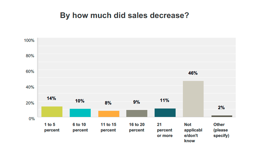 Among respondents who saw APW sales decrease, 14 percent said sales dropped up to 5 percent and 11 percent said the decline was by 21 percent or more. About 10 percent said the dip was between 6 and 10 percent and 9 percent reported a drop-off of 16 to 20 percent. Eight percent said the decline was 11 to 15 percent.