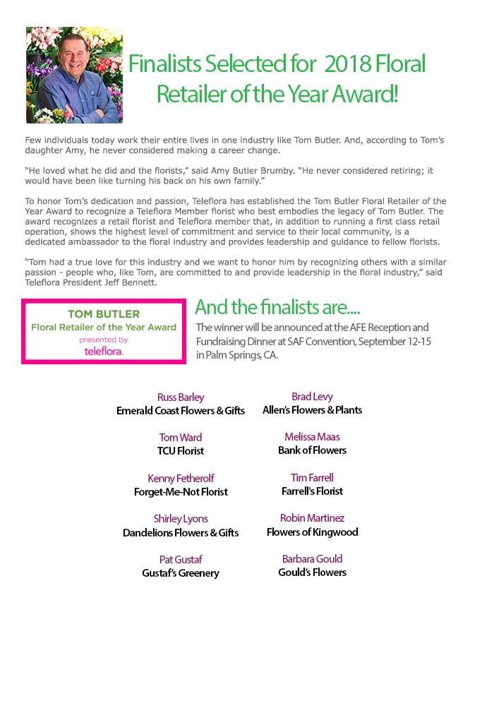 Teleflora has narrowed the contenders for 2nd Annual Tom Butler Retailer of the Year Award from 100 florist nominations to 10. This year’s recipient will be announced and honored at the American Floral Endowment (AFE) Fundraising Dinner in conjunction with the SAF Maui 2016.