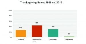 Forty-three percent of respondents said Thanksgiving sales were flat, 29 percent said they dropped and 26 percent saw sales increase.