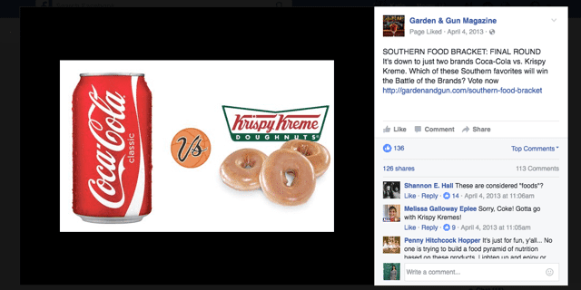Garden & Gun, a Southern lifestyle magazine, engaged readers for three full weeks with a March Madness-themed game on Facebook, asking people to vote for the ultimate Southern food.