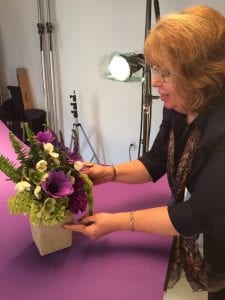 Carol Caggiano, AIFD, PFCI, puts the finishing touches on an arrangement photographed for SAF’s “Flower Power” poster.