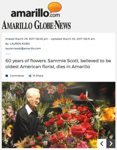 A Society of American Florists member who worked in his Amarillo, Texas, store for 60 years, died late last month. The Amarillo Globe-News ran a touching tribute to Sammie Scott, 98, of Scott’s Flowers, calling him “the oldest living florist in America” and heralding his acts of kindness and professionalism over his decades-long career.