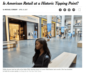 “Modern-day retail is becoming unrecognizable from the glory era of the department store in the years after World War II,” writes Michael Corkery for The New York Times. “In that period, newly built highways shuttling people to and from the suburbs eventually gave rise to shopping malls — big, convenient, climate-controlled monuments to consumerism with lots of parking.”