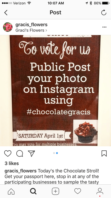 The event also included a friendly competition between the businesses to determine who had the best treat. Customers could vote for their favorite by making a public Instagram post and using the business’s hashtag (for example: #chocolategracis). A farm-to-table restaurant, Emma’s Food for Life, won with its chocolate zucchini cake, earning the coveted trophy: an inscribed chocolate-colored pot. Herrold donated a plant to go inside it.