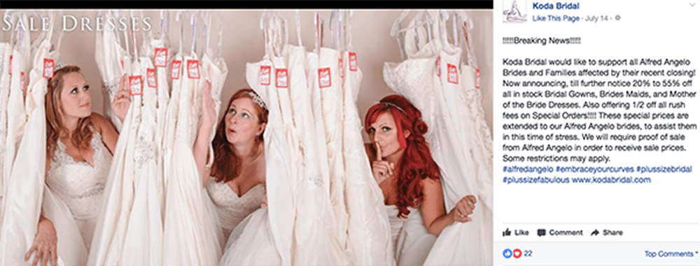 According to Fortune, “Alfred Angelo filed for Chapter 7 bankruptcy last week — meaning the company sought to liquidate rather than restructure its debt. Brides who still hadn’t received their orders from the shop with more than 60 locations panicked, wondering whether they’d get their dresses in time for their wedding — or if they would get a refund at all. In the company’s bankruptcy filing, it revealed that it had no more than $50,000 in assets, but over $50 million in debt.”