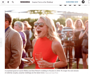The story profiles several couples who chose the surprise approach and makes the case that these brides and grooms aren’t always looking to save money (although that can be the case) — but they are looking to reduce the pre-planning fuss.