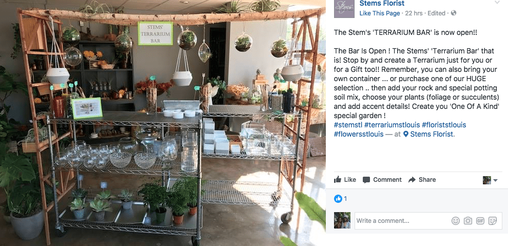 “SOOOO excited to announce the Stems’ Terrarium Bar is opening Wednesday! Stop by anytime and create a terrarium that is ‘Uniquely Yours’!” wrote Brannan on the shop’s Facebook page just two days after Profit Blast.