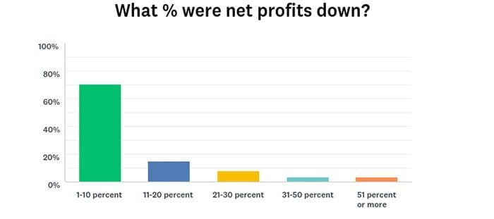 • Among respondents who said sales were down from the same period last year, 65 percent said the decrease fell between 1 percent and 10 percent. Among all respondents who said net profits were down from the same period last year, about 70 percent said they dropped from 1 percent to 10 percent.