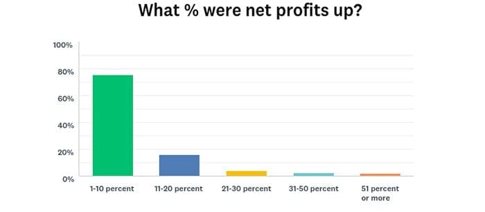 • Among those who said sales were up, 64 percent said the increase was in that same range (1 percent to 10 percent). Among respondents who said net profits were up, 75 percent said the increase was between 1 percent and 10 percent.