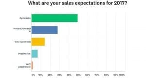 About 33 percent classified business as “OK,” and roughly 9 percent classified it as “poor” or “terrible.” Overall, nearly half of all respondents said they were “optimistic” about 2017 sales, compared to 2016 results, and an additional 14 percent said they were “very optimistic.” (Twenty-eight percent said they were “neutral.” About 8 percent classified themselves as “pessimistic” or “very pessimistic.”)