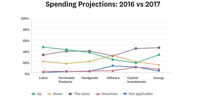 Spending: Forty-four percent of retailers plan to spend more on labor this year; 43 percent are predicting an increase in perishable product spending. About 40 percent say they expect hard good costs to remain the same while 38 percent predict an uptick.  Respondents were evenly divided among expectations for giftware spending (25 percent up, 31 percent down, 32 percent flat). Forty-three percent of retailers predict increases in capital investments and 45 percent predict higher energy costs.