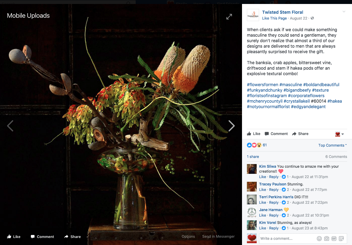 “When clients ask if we could make something masculine they could send a gentleman, they surely don’t realize that almost a third of our designs are delivered to men that are always pleasantly surprised to receive the gift,” reads the August 22 post. Accompanying the text, a high-end, high-style design that features banksia, crab apples, bittersweet vine, and driftwood, among other design elements.