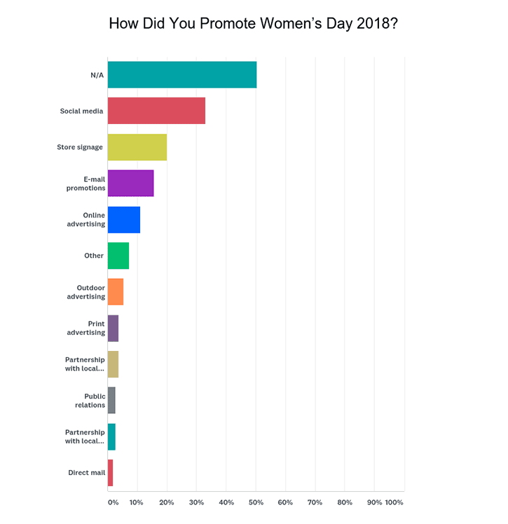 Among those who did promote Women’s Day, the most popular vehicles were social media (33 percent); store signage, posters and displays (20 percent) and e-mail promos (16 percent).
