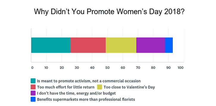 In addition, about 35 percent of respondents did not promote the event because the “holiday requires too much effort and too little return”; 8 percent abstained because they believe Women’s Day “benefits supermarkets more than florists.”