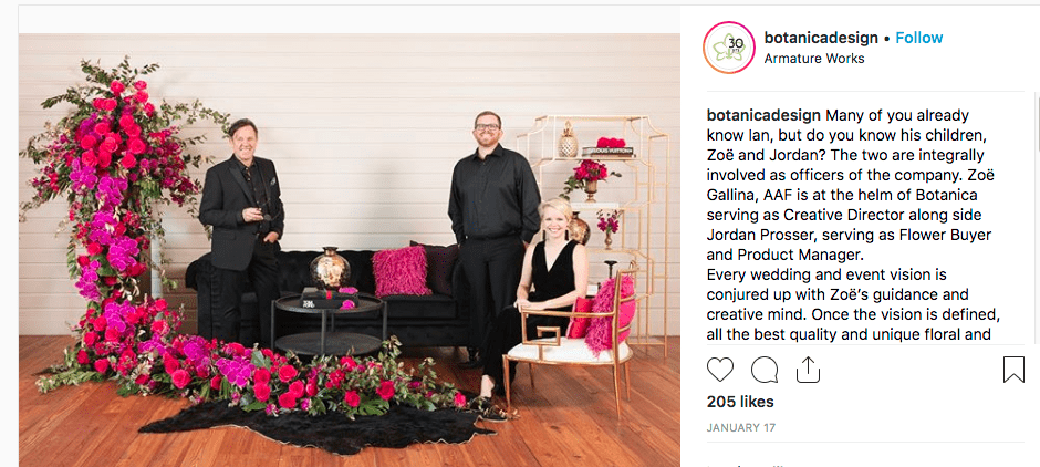 Before cuing the dancing portion of the evening, Ian Prosser, AAF, AIFD, PFCI, praised his son, Jordan, Botanica’s flower buyer, and daughter, Zoë Gallina, AAF, the company’s creative designer, for their ambition, surprising the pair by naming them his new business partners. The family also promoted their landmark anniversary through their social media channels.
