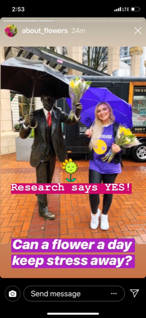 In Seattle, YouTube star Monica Church, whose channel “Millennial Life Crisis” has more than 350,000 subscribers, joined the effort to greet unsuspecting passersby with flowers and vlogged about the experience as she counted flowers as a top way to relieve stress. Her video, “6 Ways to Destress Your Life This Spring” has more than 18,500 views and counting.