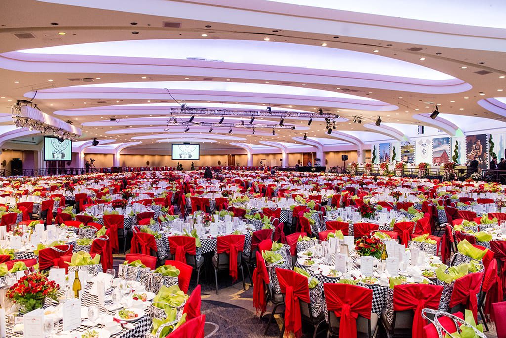 Since the chair of this year’s event, Jennifer Messer, wife of Rep. Luke Messer (R-6-Indiana), was from the Hoosier State, the chosen theme was the Indy 500. “My challenge was to take that theme and make it a little more feminine,” said Kinnane. All 144 tables in the ballroom were decked with linens in black and white checks. Popping against that background, table arrangements were filled with red and burgundy flowers.