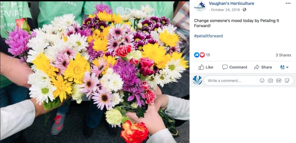 “As a team we leave our computers behind and gather in the conference room to put together lots of bouquets and then pass out the flowers with no strings attached — the smiles are rewarding enough,” said Ashleigh Newton, a customer service representative with Vaughan’s Horticulture in Naperville, Illinois. Last year was Vaughan’s first year participating, handing out 200 bouquets that were donated by growers and vendors for its in Petal It Forward event.