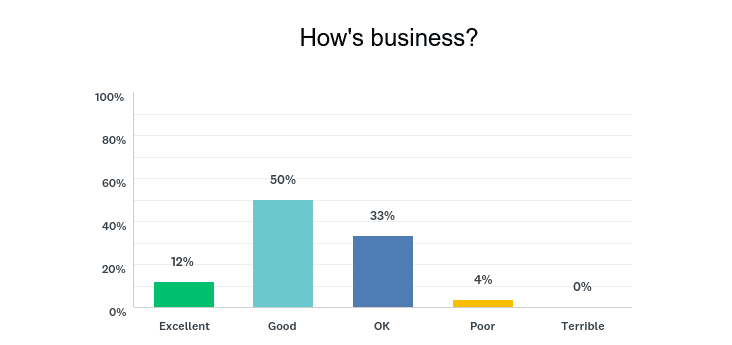 About 50 percent of respondents said business is “good”— another 12 percent classified it as “excellent.” Meanwhile, about 33 percent said business is “OK.” The rest of respondents, around 5 percent, said business is either “poor” or “terrible.”