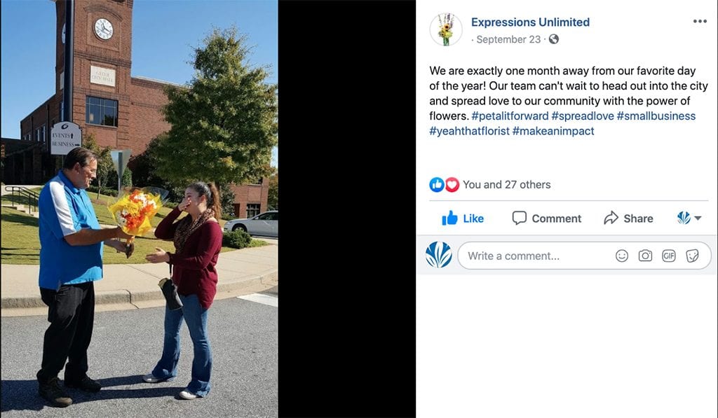 Expressions Unlimited in Greenville, South Carolina is getting the buzz going on its Petal It Forward event with this Facebook post on Sept. 23: “We are exactly one month away from our favorite day of the year! Our team can’t wait to head out into the city and spread love to our community with the power of flowers. #petalitforward #spreadlove #smallbusiness #yeahthatflorist #makeanimpact”