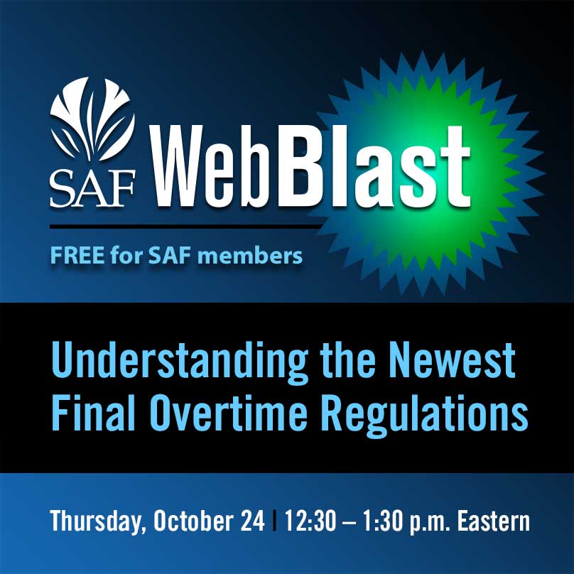Jessica Summers, Strategic Policy Director of the SBLC, will recommend the steps employers need to take before the rules go into effect during the Oct. 24 WebBlast, “Understanding the Newest Final Overtime Regulations.” The WebBlast takes place 12:30-1:30 p.m. Eastern and is FREE for SAF members as long as they list “SAF” under “Which SBLC member association are you affiliated with?” when registering.