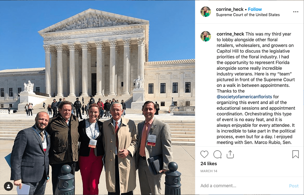 “This was my third year to lobby alongside other floral retailers, wholesalers, and growers on Capitol Hill to discuss the legislative priorities of the floral industry. I had the opportunity to represent Florida alongside some really incredible industry veterans. Here is my ‘team’ pictured in front of the Supreme Court on a walk in between appointments,” Corrine Heck (center) of Details Flowers posted to Instagram during last year’s CAD. “It is incredible to take part in the political process, even but for a day. Can’t wait to attend this event in 2020!”