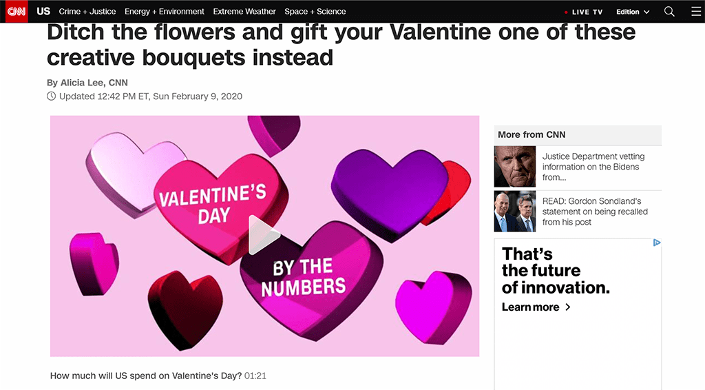 “Ditch the flowers and gift your Valentine one of these creative bouquets instead,” was the headline CNN used for a story that encouraged readers to choose bouquets of breadsticks, bacon and doughnuts rather than flowers.
