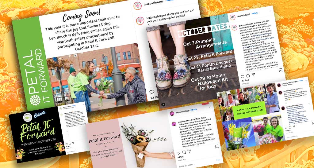 LOOKING GOOD! SAF members have been promoting this year’s Petal It Forward like the pros they are online this year. Among some standout posts on Instagram that captured our attention were those from Lakeview Floral & Gifts in Menomonie, Wisconsin; Blooms in Hand in Montclair and Essex County New Jersey; Petersen & Tietz Florists in Waterloo, Iowa; Len Busch Roses in Plymouth, Minnesota; and Candlelight Floral and Gifts in the Twin Cities region.