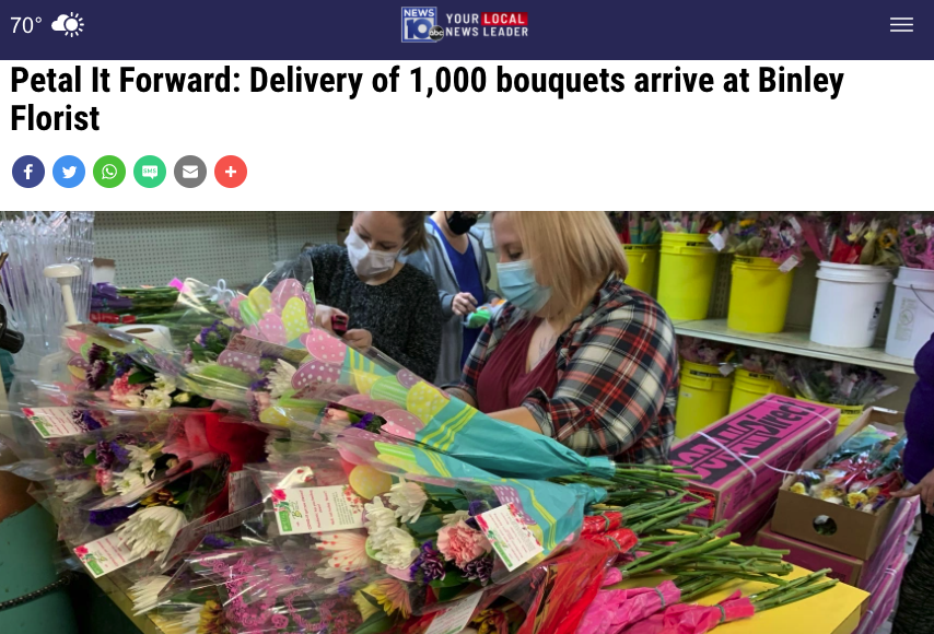 Binley Florist in Queensbury, New York, invited Cassie Hudson of the News 10 into the shop last Friday to watch the staff unpack and hydrate a shipment of 1,000 Petal It Forward bouquets. For its fifth year participating in SAF’s benevolence project, Binley Florist will have team members — dubbed “the Petal Patrol” — stationed around the community to share joy with random passersby. The business promoted the event robustly on social media, including live videos and posts that were shared by groups such as the Adirondack Regional Chamber of Commerce.