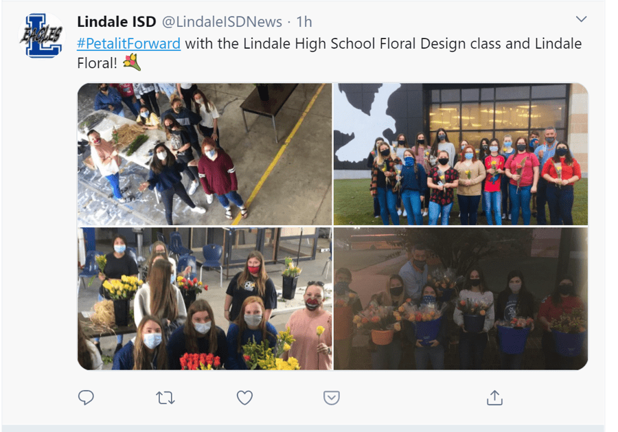 Speaking of team spirit, In Lindale, Texas, the team at Lindale Floral reprised its 2019 approach, collaborating with the local high school. On Tuesday, students from Lindale High School visited the shop to arrange bouquets, which they distributed in pairs to classmates the following day.