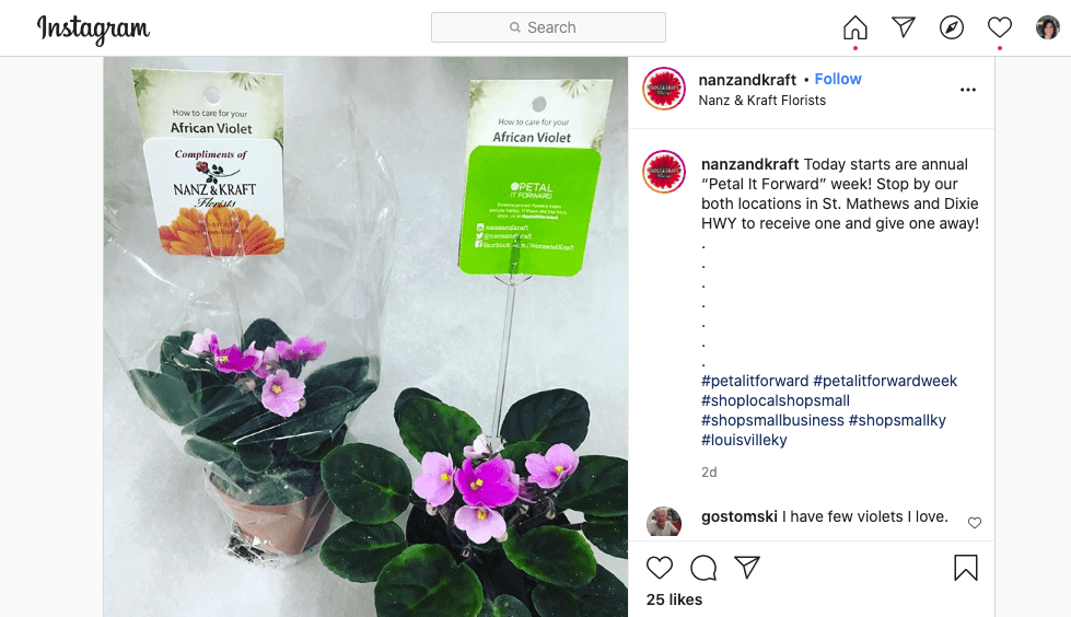 Nanz & Kraft in Louisville, Kentucky, turned Petal It Forward into a weeklong celebration, offering shop visitors a pair of potted African violets — one to keep and one to give away. Usually, Nanz & Kraft employees stand on the street somewhere in Louisville for a day and hand out two flowers to passersby. But concerns about virus transmission prompted them to host an in-store celebration instead. Last year, the business passed out about 1,000 flowers and plants and David Kraft told The Voice Tribune the team has “always receive excellent feedback.”