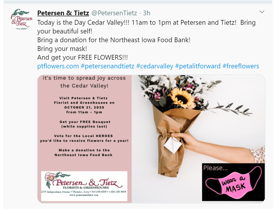 In Waterloo, Iowa, Petersen & Tietz also added some extra charitable love to their Petal It Forward, encouraging recipients to nominate a hero to receive flowers and to make a donation to the Northeast Iowa Food Bank.