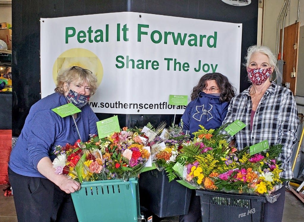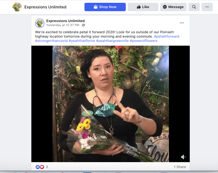 Longtime Petal It Forward participants Expressions Unlimited in Greenville, S.C. shared a cheerful video on social media that stressed the safety precautions the business was taking, including limiting crowd interactions and incorporating social distancing at giveaway sites. Among the messages in the video: “If you happen to be driving by and you see people with flowers, we’re only demonstrating the fact that flowers make people’s day better and we just want to give them to you!”