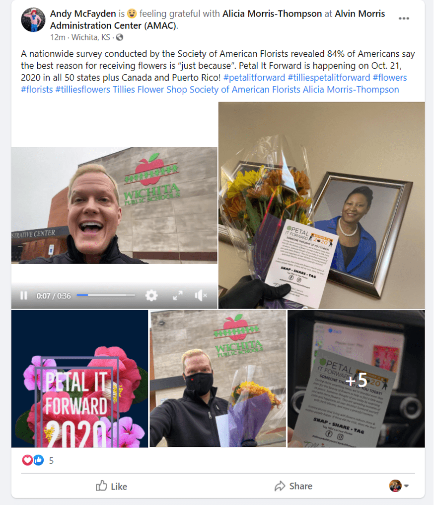 Tillie’s Flower Shop — a first time Petal It Forward participant — dispatched 35 Happiness Ambassadors around Wichita, Kansas, to (safely) help the business with its effort. The shop used SAF’s university research to help make the case that flowers and plants are an important part of people’s lives, now more than ever.