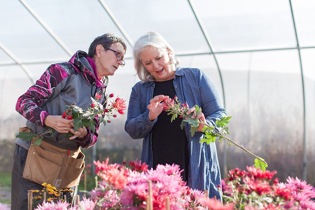 Vivian Larson (left), grower and owner of Everyday Flowers in Stanwood, Washington, and Debra Prinzing, admire heirloom chrysanthemums in Larson’s high tunnel. Prinzing is the author of “Slow Flowers” and an advocate for domestically grown flowers. Photo by Missy Palacol Photograph.
