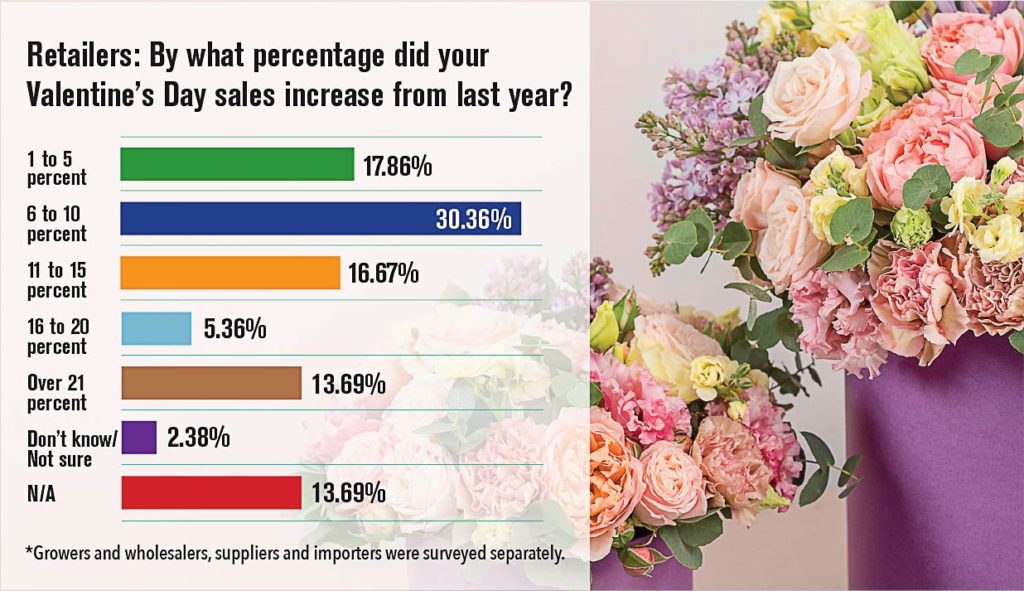 Respondents to an SAF survey reported year-over-year increases in Valentine’s Day sales, and reported that they felt optimistic about sales this year.