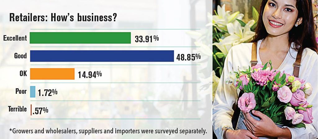 The survey drew nearly 400 responses from the retail, grower, and wholesale, supplier and importer segments. More than half of floral industry businesses closed 2021 with higher gross sales than in 2020, according to the survey. Nearly 27 percent of respondents reported their sales were about the same, while 16 percent reported a decrease. Business was ‘excellent’ or ‘good’ for 75 percent of respondents.