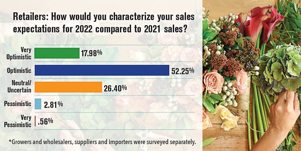 About 65 percent indicated they felt very optimistic or optimistic about their sales for 2022, with some respondents noting the return of events and the anticipated wedding boom.