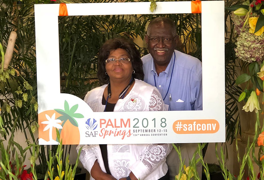Patricia Houck with her husband Allen, at SAF’s 2018 annual convention in Palm Springs, California. Houck’s business, House of Blooms in Sugar Land, Texas, serves a diverse clientele whom Houck enjoys getting to know.