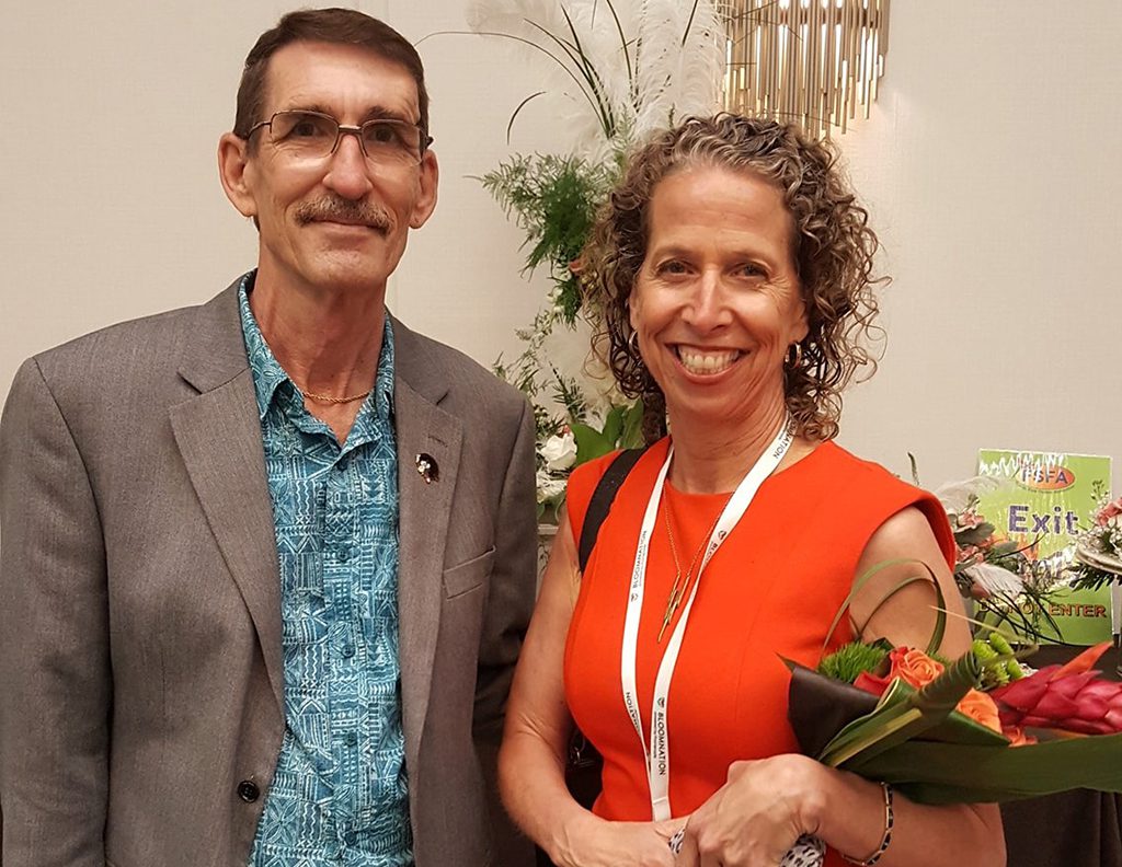 Florist-tested ideas for driving growth and profits was the theme a presentation at the Florida State Florists Association’s annual convention given by SAF CEO Kate Penn, shown with FSFA Executive Director Bob Tucker, AIFD, CFD, FSFA.