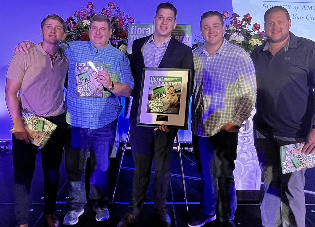The winner of the 2022 Marketer of the Year contest, Ryan Black of Jet Fresh Flower Distributors in Miami, is flanked by his brothers and his father, Mike Black, who started the company. Pictured are Connor Black, Mike Black, Ryan Black, Casey Black, and Mike Black Jr.