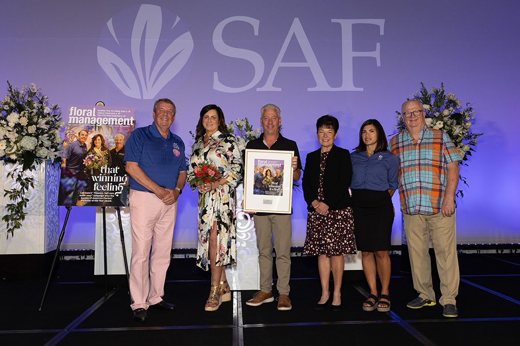 Joost Bongarets, CEO of Florabundance and a member of CalFlowers’ board of directors; Jeanne Boes, general manager and COO of the San Francisco Flower Mart and CalFlowers’ president-elect and a board of director; and Steve Dionne, AAF, executive director of CalFlowers, accepted the Marketer of the Year award. They were joined by Anne Stewart, vice president of Smithers Oasis North America; Amanda Jedlinsky, Floral Management editor in chief; and Dwight Larimer, AAF, PFCI, founder of Design Master, now a division of Smithers Oasis.