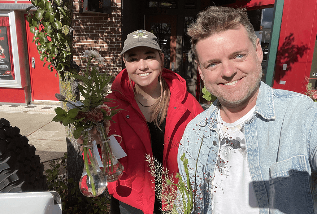 Derek Woodruff, AAF, AIFD, PFCI, of Floral Underground in Traverse City, Michigan, and his helper, Libby Hogan, distribute bouquets for Petal It Forward.