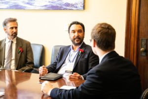 Scott Blumenthal, general manager of Chrysal in Doral, Florida (left), and SAF President & Chair Oscar Fernandez, director of sales for Rio Roses Equiflor in Doral, Florida (right), talk with a congressional aide last year during SAF’s Congressional Action Days.