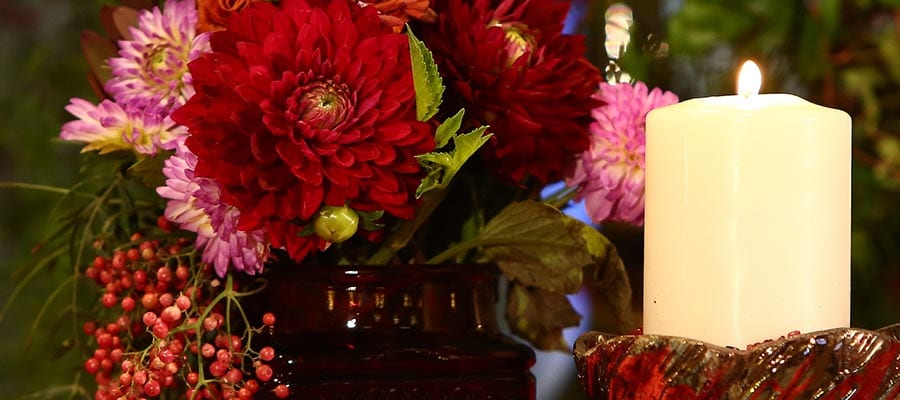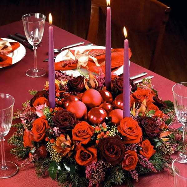 Candles added to a centerpiece create a sense of warmth and glow to the holiday table. Shiny decorative balls incorporated into a centerpiece will reflect the light for an even more festive feel.