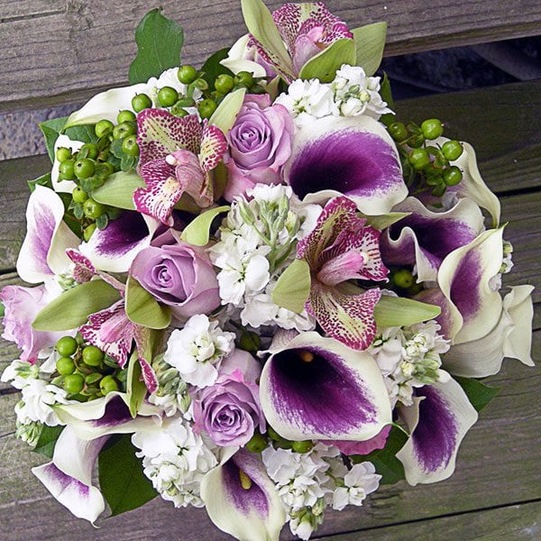 - Rich royal-colored floral bouquet consisting of a mixture of textural materials such as purple tulips, magenta stock, green hydrangea and lavender roses tied with natural raffia. The design may include clusters of grapes.