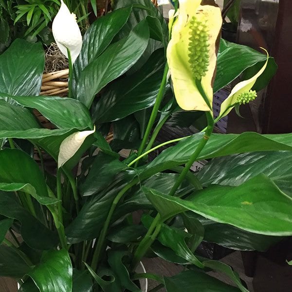 Description: Dark green leaves can be more than a foot long. Plants are uniform and full. They produce hood-shaped white blooms, or spathes, which surround a creamy-white spadix. Plants grow 1 1/2 to 4 feet tall, depending on the cultivar. Some cultivars are developed to be compact.